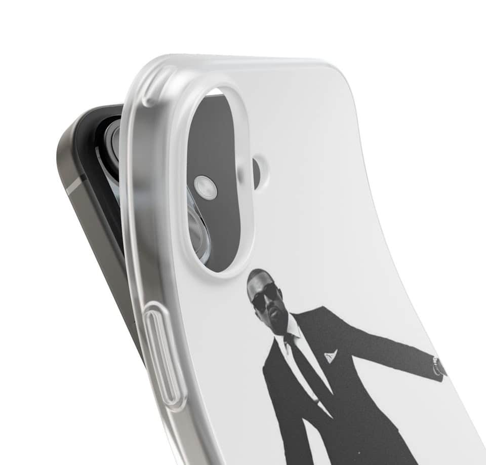 Stylish Kanye West themed phone case featuring a monochrome image of Kanye in a suit with sunglasses. Perfect for fans to showcase their admiration for Kanye West's fashion and music influence.